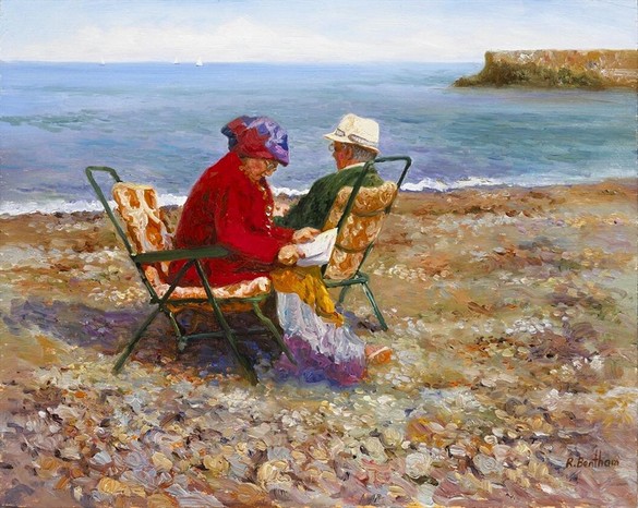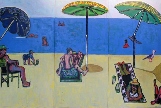 Chacun est plongé dans ses occupations. Une seule lit dans le tryptique de Stephen Armstrong. Et vous, que faites-vous à la plage?