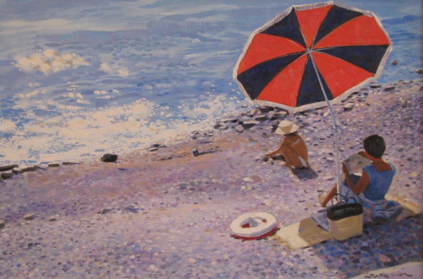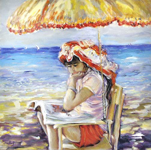 La lectrice de Michael Lowenbein lit-elle à haute voix une histoire qui se perd dans les vagues de l’océan, sa fille occupée à écrire son nom dans le sable? Et si c’est le cas, quelle histoire peut-elle bien lui lire un dimanche matin sur la plage?