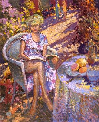 Tout ça pour dire qu’une nouvelle toile est à vous. Avec tout ce qu’elle pourra raconter. Tout ce qu’elle pourra susciter ou évoquer. Tout ce qui fait qu’elle prendra vie grâce à vous. À vos mots. À votre imagination. Et qu’il serait vraiment dommage que les personnages de Chris Mangum, deux lisant et une rêvant, n’aient rien à vous raconter, alors que je vous imagine déjà vous précipitant sur le clavier ou votre plume. Serait-ce moi qui possède trop d’imagination? Nous le saurons dans une semaine alors que j’accrocherai une nouvelle toile en même temps que je validerai vos écrits.
