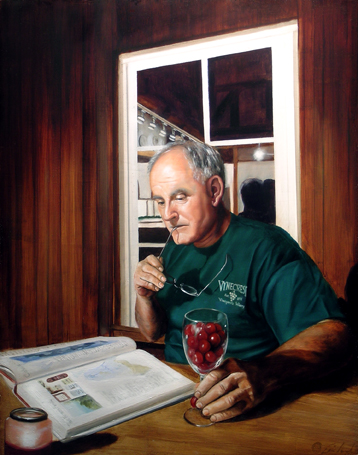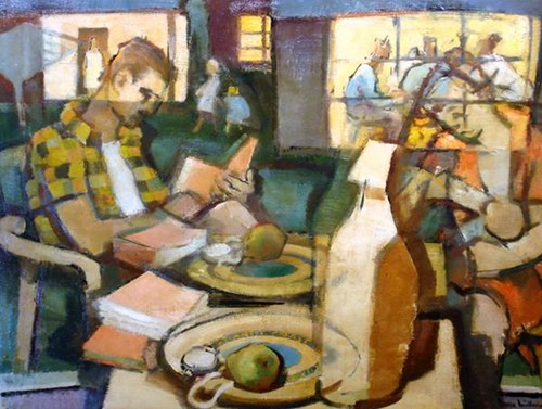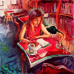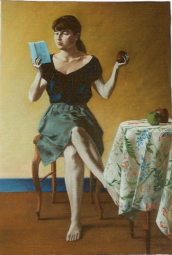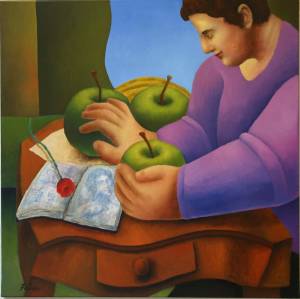Lire donnerait-il faim? L’écriture créerait-elle un petit creux? Faut-il nourrir corps et esprit de pair? La galerie de lecteurs du jour pourrait en effet laisser entendre ce double appétit. Fruits, morceau de pain ou autres aliments seront donc au cœur des toiles du jour, en commençant par les cerises du lecteur d’Eric Armusik. Et parce que la littérature et les livres sont des sujets inépuisables, les citations accompagnant ces lecteurs affamés porteront sur ces vastes sujets.