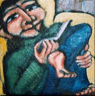 L’écrivain peint par l’artiste Peter Jakob Horemans s’était installé loin des regards pour écrire tranquille. Espérons que le visiteur venu l’interrompre ne lui prendra pas trop de son temps. En effet, il a pour projet d’écrire un texte à partir de la toile proposée dimanche. Vous aussi, n’est-ce pas?