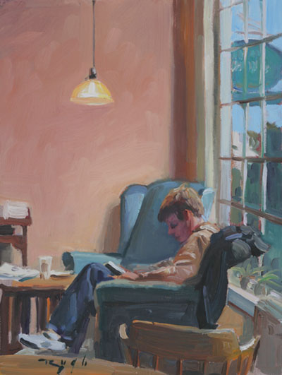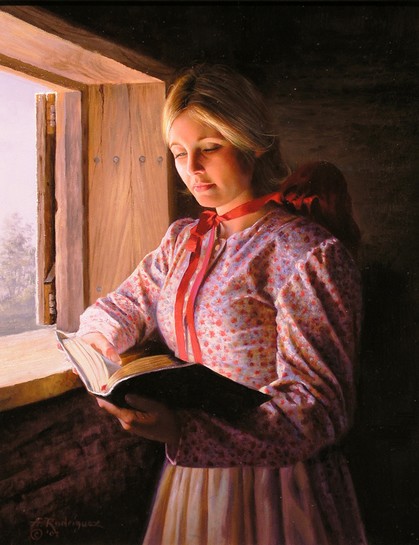 Parce que nous voici à cette dernière fin de semaine du mois le plus sombre de l’année, le plus gris, le plus pluvieux, celui où nous regardons par la fenêtre plus que nous sommes dehors, j’ai décidé de consacrer le samedi et le dimanche aux toiles représentant des lecteurs et des lectrices dans des décors où il y a des fenêtres. Pour ce que les fenêtres représentent de liberté et d’ouverture sur le monde. La lectrice d’Alfredo Rodriguez vous dira à quel point elles lui sont vitales si vous osez le lui demander.