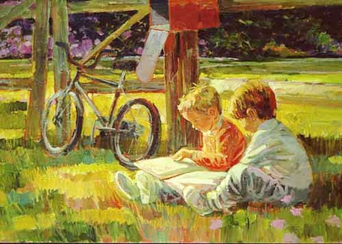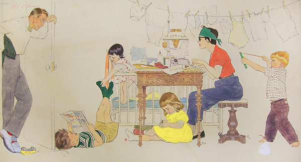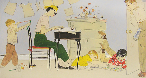 Paul Burns, illustrateur américain, avait le sens de l’humour, comme le prouvent ces scènes que je vous offre en ce dimanche. La lessive est faite, les enfants ont des livres, tout va pour le mieux dans le meilleur des mondes pour l’écrivaine du jour que je vous invite à nous raconter en vos mots. Comme vous le faites dimanche après dimanche depuis bientôt quatre ans. Avec humour, avec sagesse, avec ces regards qui n’appartiennent qu’à vous et qui nous donnent à examiner des toiles avec vos yeux.