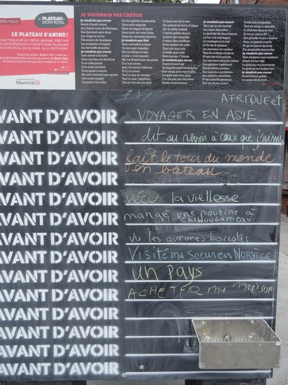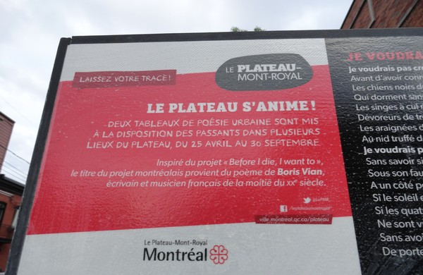 Si vous empruntez la rue Fairmount, arrêtez-vous au coin de la rue Clark et laissez vos traces, même si elles ne seront pas indélébiles. Question de faire un clin d’œil à Boris Vian et de vous exprimer en ajoutant quelques mots à « Je voudrais pas crever avant… »