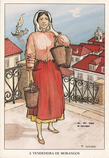 Comme nous sommes aujourd’hui le 23 avril, soit à deux jours de l’anniversaire de la Révolution de Œillets, j’ai choisi de partager avec vous une série de 24 cartes postales portant sur les marchands des rues de Lisbonne, que j’ai eu le bonheur de trouver en ligne récemment, laquelle a été publiée dans les années 1980. Pour le plaisir de vous les montrer, tout simplement. En commençant par celle-ci, mettant en scène la vendeuse de fraises.