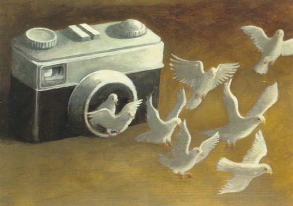 Cette illustration sue carte postale de l’artiste allemand Peter Gut m’a tout de suite fait penser à ce que disaient certains photographes : On ne bouge plus, le petit oiseau va sortir!