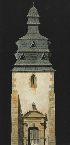 Le clocher de l’église du Faouët, une illustration de Bruno Lenormand pour le Guide Gallimard Morhihan.