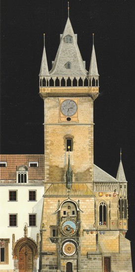 L’horloge de l’hôtel de ville, une illustration de Maurice Pommier pour le Guide Gallimard Prague.