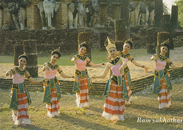 C’est à Sukhothai, ville historique inscrite au Patrimoine de l’Unesco, qu’ont été vues ces danseuses. Posaient-elles pour le photographe ou était-ce à l’occasion d’un spectacle? L’histoire ne le dit pas.