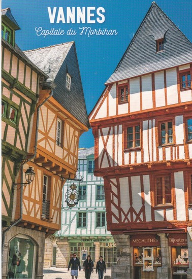 Quel bonheur de trouver dans ma boîte aux lettres une carte postale envoyée par Étienne, l’un des traducteurs pigistes avec qui je travaille, et d’un endroit que j’aime particulièrement. Pensée pour Chantal qui m’a fait découvrir Vannes il y a plus de 40 ans. Au premier plan, les logis à pans de bois de la place Saint-Pierre et au fond, la place Henri-IV.