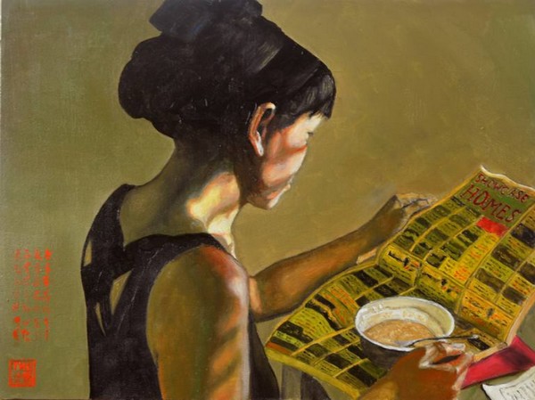 C’est avec une certaine nostalgie que je vous offre cette toile de l’artiste Thu Nguyen afin que vous la racontiez en vos mots, comme vous le faites si bien semaine après semaine. Oui, nostalgie. Car les samedis matins à lire les pages culturelles du journal datent de bien longtemps en ce qui me concerne. Pourtant, j’aimais bien ces moments où je prenais le temps…