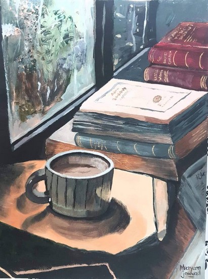 Avec le froid qui sévit sur Montréal depuis hier et qui va durer quelques jours, il vaut mieux ne pas sortir si c’est possible, et rester au chaud en compagnie d’une pile de livres et d’une tasse de thé ou de café. D’où le choix de ce tableau de l’artiste Maryam Jawwad afin que vous le racontiez en vos mots, comme vous le faites si bien semaine après semaine.