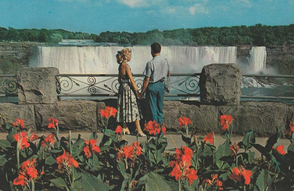 Autrefois, les chutes Niagara constituaient la destination par excellence pour les voyages de noces. Cette carte postale date fort probablement de cette époque dorée. Je ne serais d’ailleurs pas surprise de la retrouver dans des dépliants publicitaires des années 1950. Un bel ajout à ma collection!