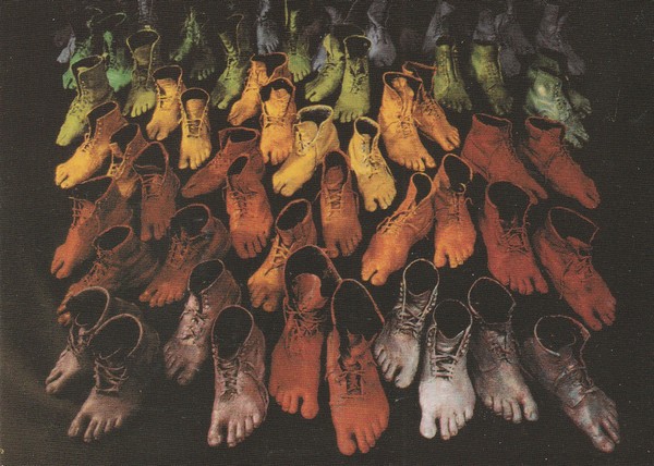 Des pieds et des chaussures de toutes les couleurs. Une installation de l’artiste multidiscipinaire Ron English, inspirée par une célèbre toile de René Magritte.