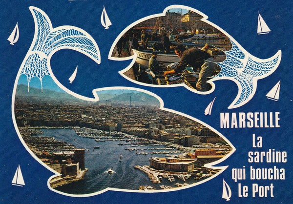 Vous connaissez l’expression, mais saviez-vous qu’elle est née d’une coquille? Ce n’est pas une sardine qui a bouché le port de Marseille, mais la Sartine. Une carte postale rapportée de mon premier voyage en France, en 1981.